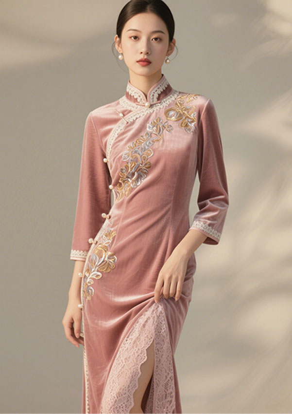 庆典旗袍承袭民国海派旗袍的形制精髓,融合京派刺绣的华贵与苏工剪裁的雅致,专为婚礼、晚宴、国事等重大场景而生。其设计以“形制为骨、纹样为魂”,保留立领斜襟、开衩盘扣等经典元素,通过立体剪裁重构曲线美学,确保行走时裙摆如流水般舒展,静立时腰臀曲线若隐若现,诠释“藏与露”的东方审美哲学。